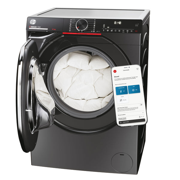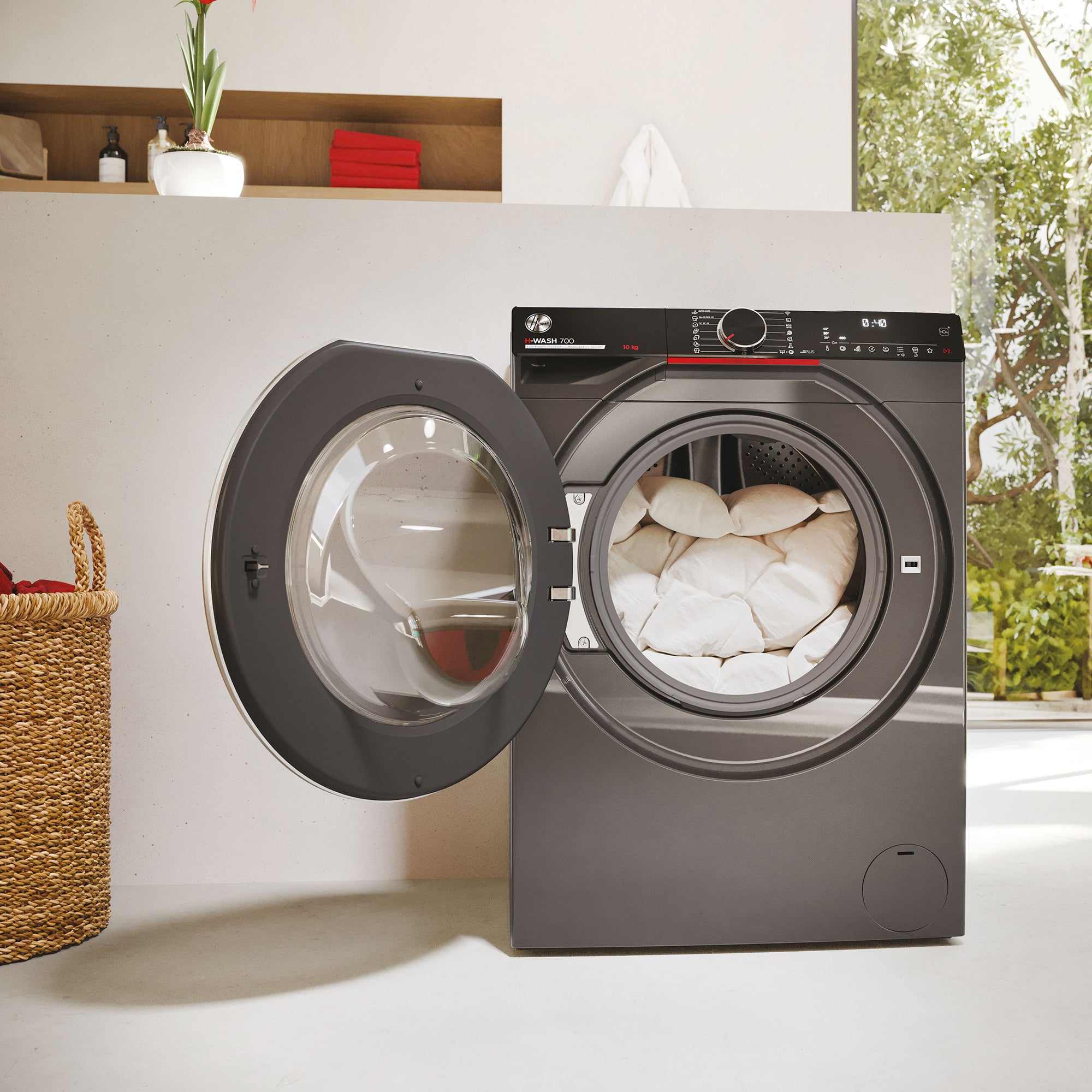H-Wash 700 - Anthracite - 10KG is an A-Class energy-efficient washing machine delivering excellent results, savings, and superior fabric care. Its Ultra Wide Care Drum ensures top performance in a compact depth, while the hOn App offers endless cycle combinations for even greater efficiency.