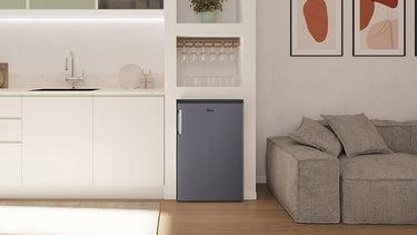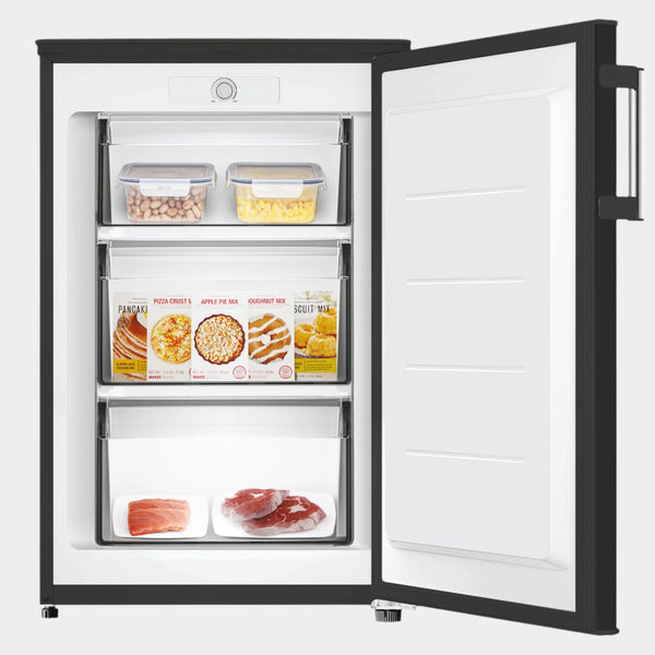 A freestanding under-counter freezer - Black - 85L designed to safely store your food for extended periods, ensuring maximum freshness, preservation, and protection from spoilage.